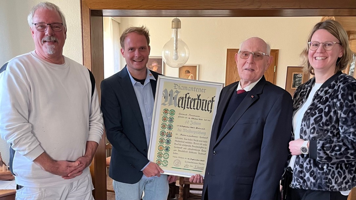 Herr Helmut Neumann aus Ahlen wurde mit dem Diamantenen Meisterbrief ausgezeichnet, einer der höchsten Ehrungen des Handwerks, die für 60 Jahre Meisterwürde, jahrzehntelange Treue und herausragende Verdienste verliehen wird.