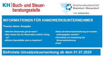 Der neue Newsletter „Steuerinformationen“ mit dem Schwerpunktthema „Befristete Umsatzsteuersenkung ab dem 01.07.2020“ wurde am 24.06.2020 an alle Innungsmitglieder per E-Mail versendet.